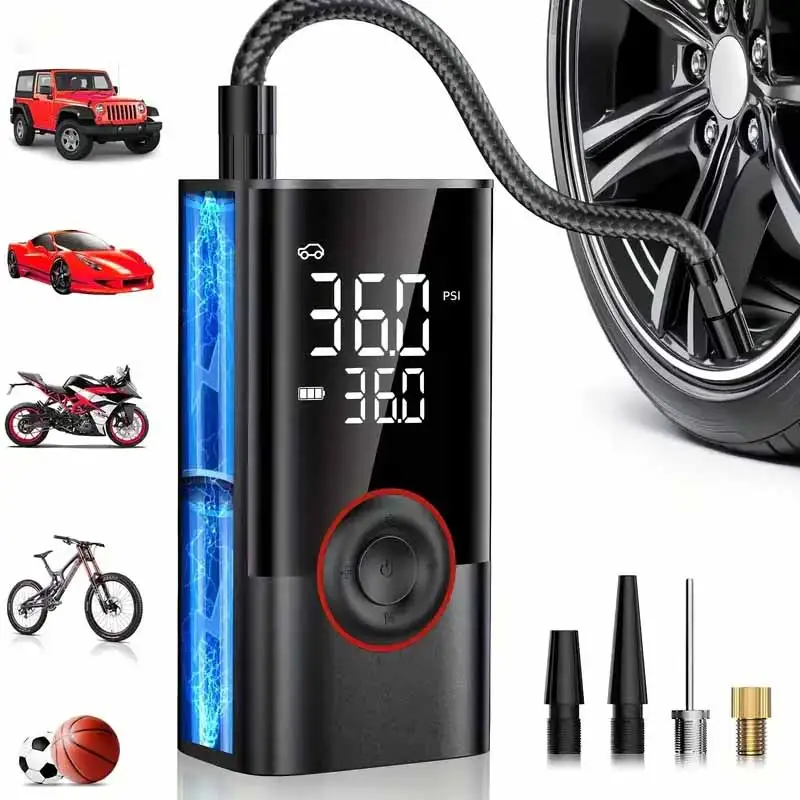 Portable 150PSI smart air pump with digital pressure gauge. Fast and accurate inflation for car, bike, motorcycle tires and sports balls. Compact and easy to carry.